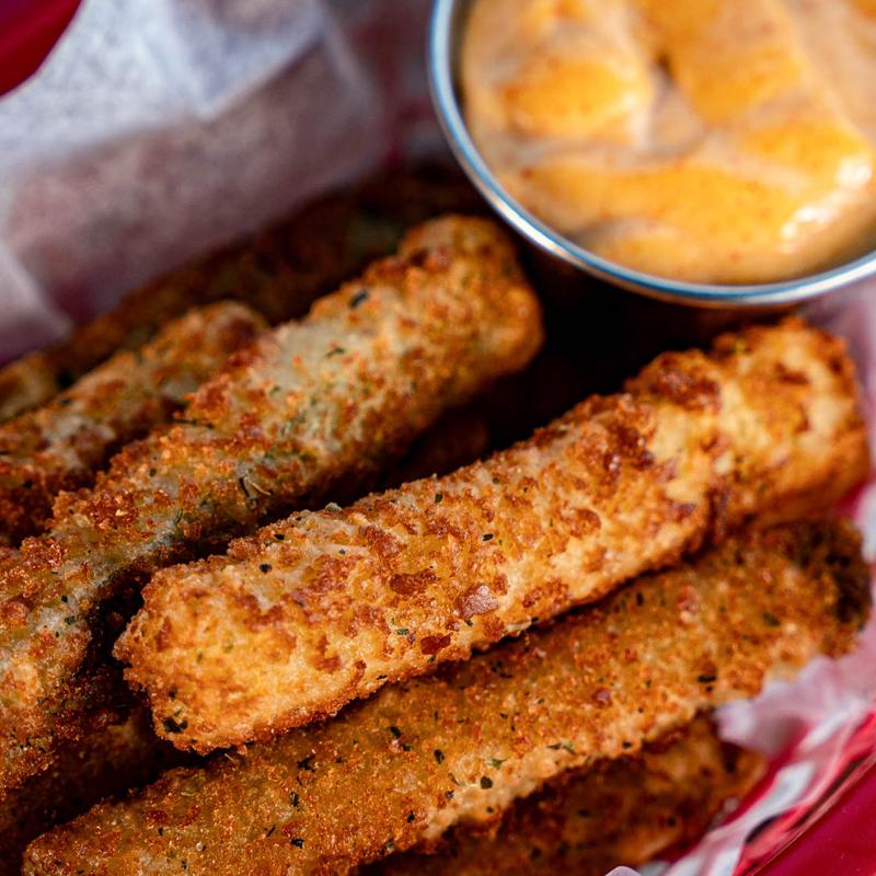 Deep fried stuffed with pork, pizza sauce, and mozzarella