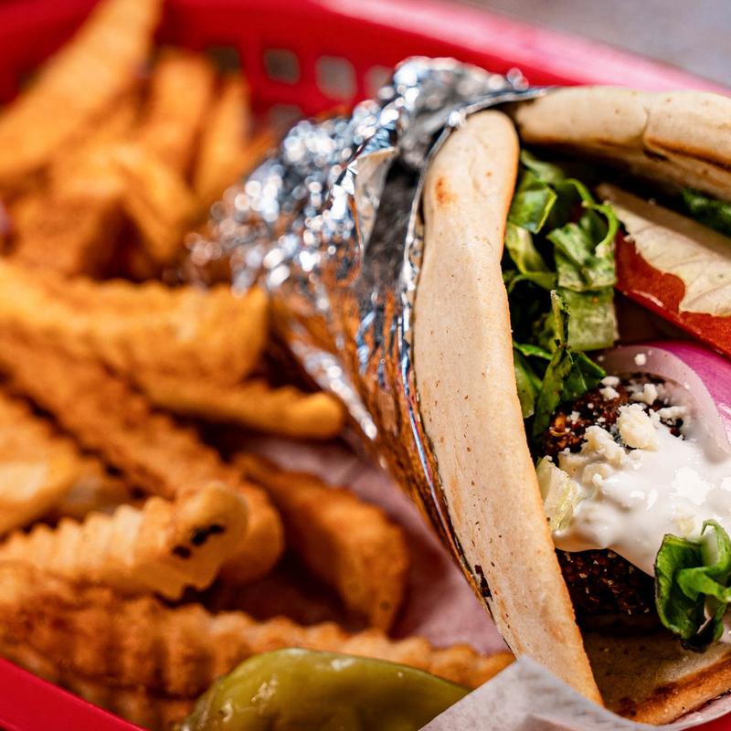 Fried chick peas served on a buttery pita with Feta cheese, lettuce, tomato, onion & tzatziki sauce.