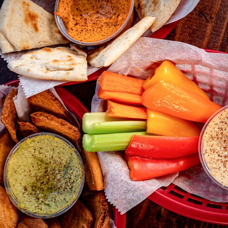 (four great flavors to choose from) A thick spread made from chick peas, sesame seeds, garlic, lemon & extra virgin olive oil (served with your choice of pita chips or buttery pita bread) | Roasted Red Bell, Pepper, Spicy Red Bell Pepper, Cilantro Jalapeno, Traditional Garlic