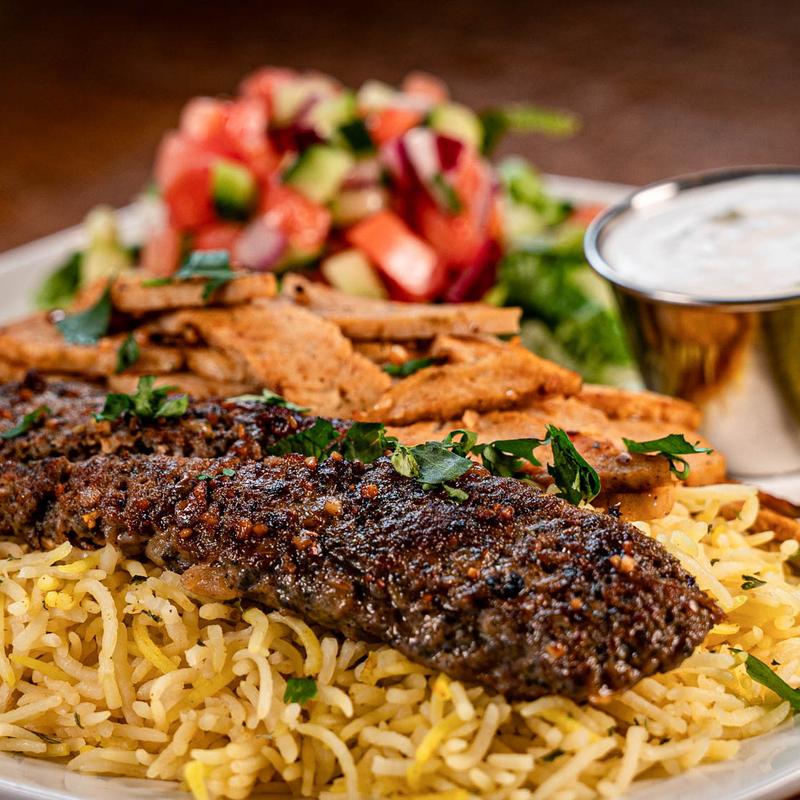 Your choice of 2 proteins: gyro, chicken gyro, kabob (chicken or lamb), chicken shwarma, or falafel. Served on Basmati rice, with a greek island salad, a side of tzatziki sauce & a pepperoncini | Lunch Special - 1 protein $10.49
