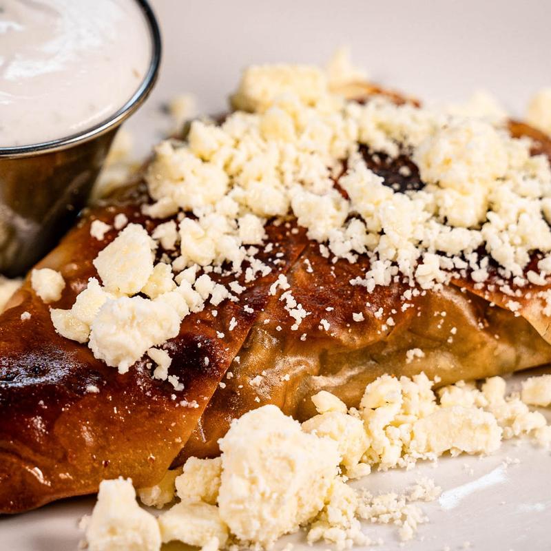 Filo dough stuffed with spinach & feta cheese then topped with even more feta cheese & a side of tzatziki sauce.